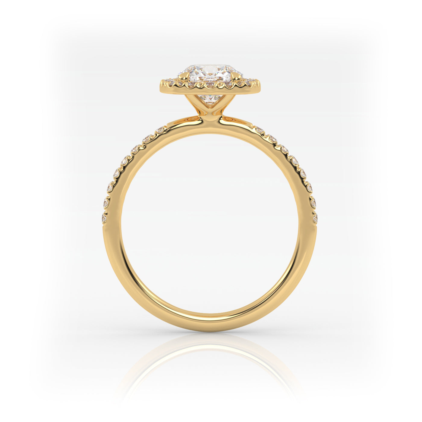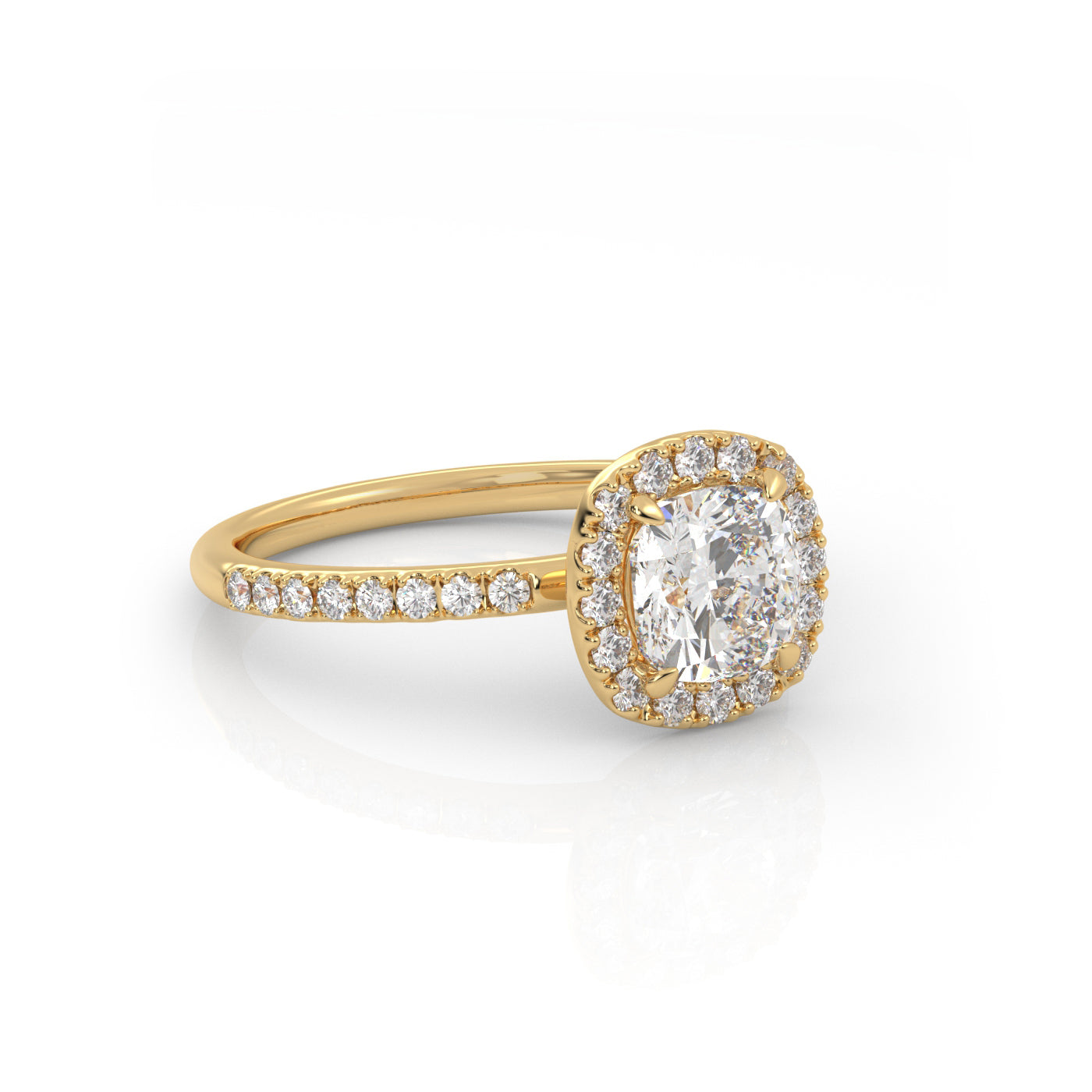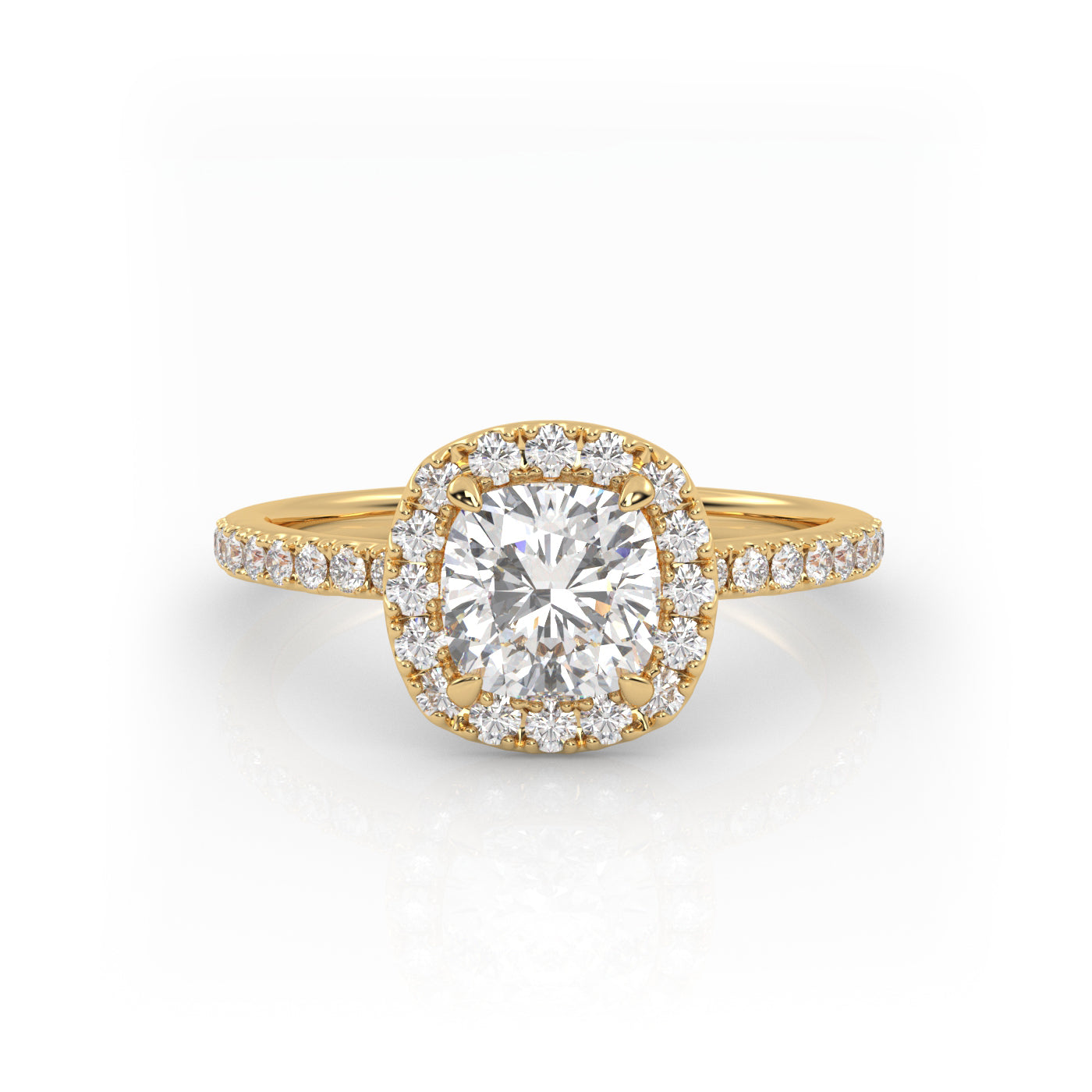 Solitaire Ring with halo & pave band The Cushion Solitaire Labgrown Diamond Color: E - VS1 Gold 18K Color: Yellow. Select your size and center diamond carat. (The picture shows a diamond size of 1 Carat). Delivered with certificate.