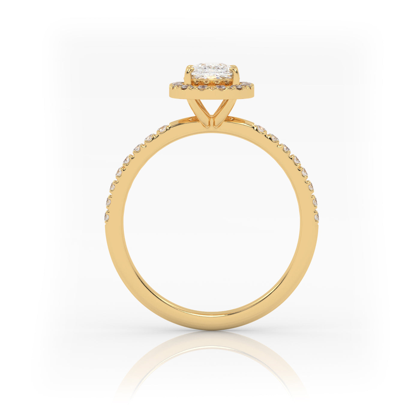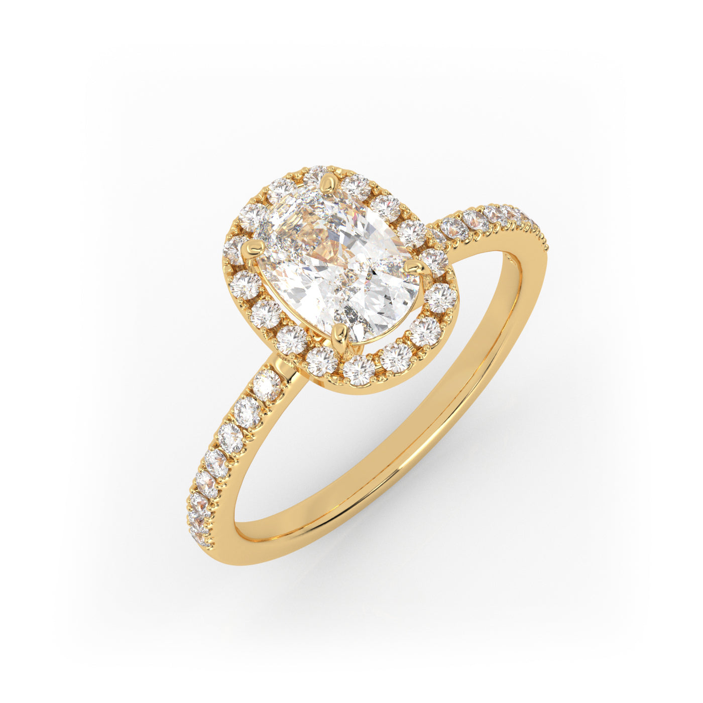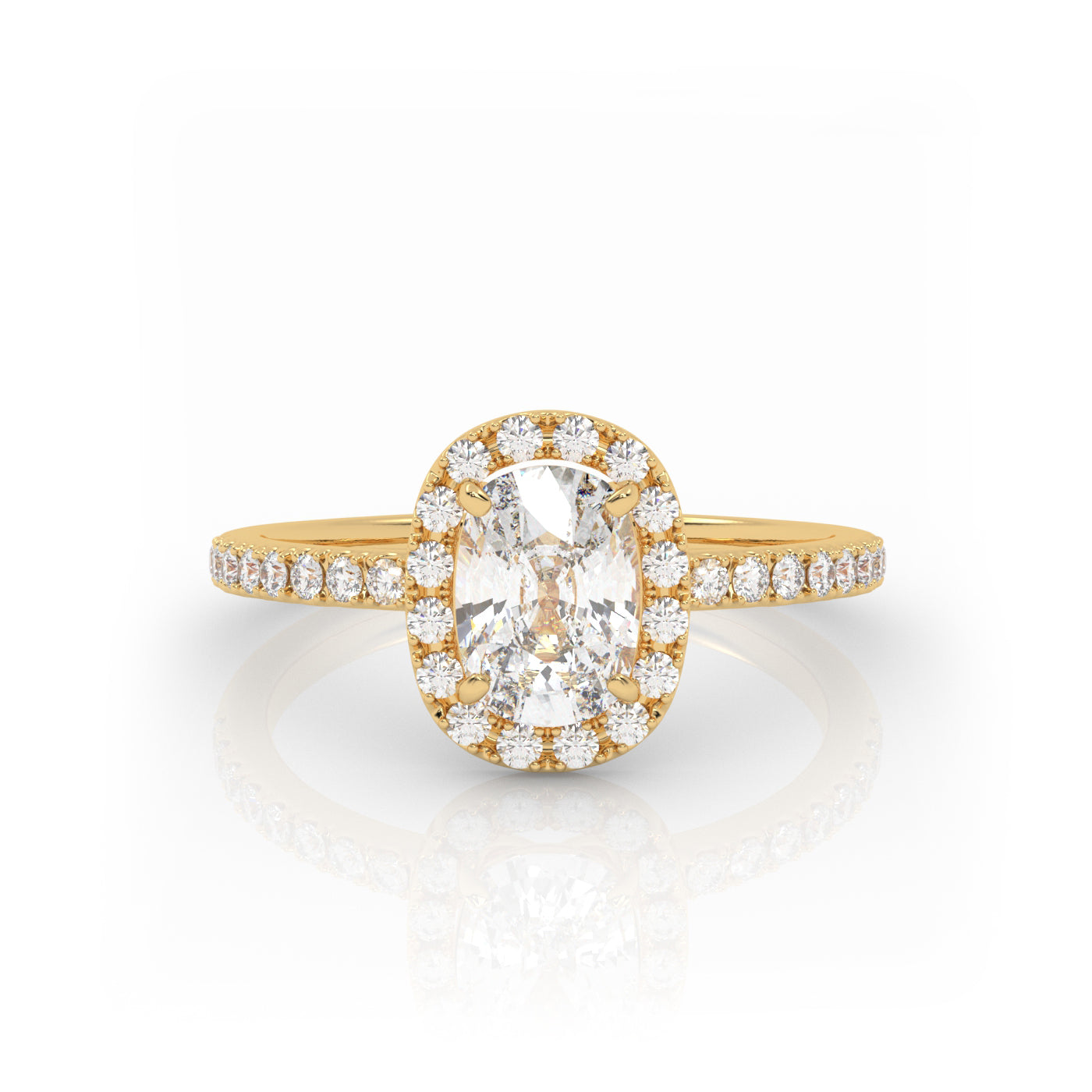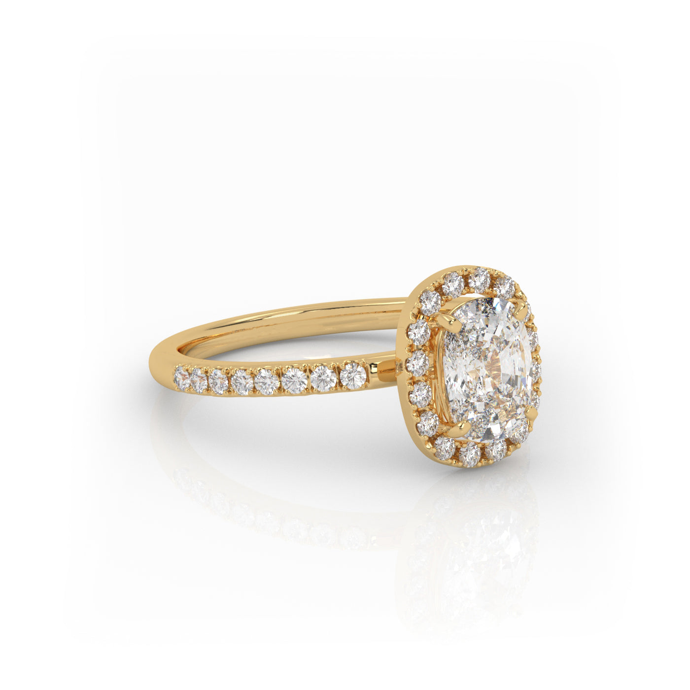 Solitaire Ring with halo & pave band The Elongated Cushion Solitaire Labgrown Diamond Color: E - VS1 Gold 18K Color: Yellow. Select your size and center diamond carat. (The picture shows a diamond size of 1 Carat). Delivered with certificate.